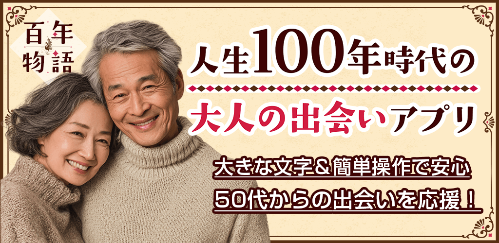 「人生100年時代」—50代からの出会いを、もっと自由に、もっと楽しむために。『百年物語』は、50代・60代・70代以上の方々が安心してつながれる“人生の第二章”を応援する大人のための出会い・交流マッチングアプリです。